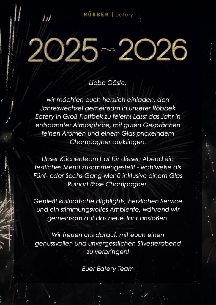 Inmitten der idyllischen Umgebung von Groß Flottbek ist mit der Röbbek Eatery ein Ort des Zusammenkommens entstanden. Doch für uns geht es hier nicht nur um das Essen auf eurem Teller. Wir legen Wert auf das Gesamterlebnis, das ihr bei uns habt. Mit einer liebevollen Aufmerksamkeit für jedes Detail und einer persönlichen Note möchten wir jeden Besuch zu etwas Einzigartigem machen. Gastfreundschaft bedeutet für uns, dass ihr euch wie zu Hause fühlt und eine schöne Zeit inmitten gastronomischer Qualität und einem einladenden Ambiente genießen könnt. Deshalb laden wir euch ein, bei uns zusammenzukommen, um gemeinsame Momente zu teilen, die kleinen Freuden des Lebens zu genießen und Erinnerungen für die Ewigkeit zu schaffen. Für uns ist die Eatery ein Ort, wo Essen zum gemeinsamen Erlebnis wird – beautiful cooking, gemeinsam genießen.